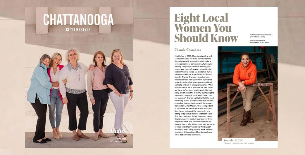 Established in 2015, Chambers Welding and Fabrication holds the most certifications in the industry with one goal in mind: to be a cornerstone in our community. A full service welding company, Chambers Welding provides a vast range of services on residential and commercial scales. As a veteran, nurse, and Human Resources professional CEO and founder Chanda Chambers took her foundational careers and applied her experience towards the discipline, compassion, and leadership to embark in entrepreneurship. “What is important to me is ‘who we are’ and ‘what we stand for’ as far as quality work. Not just being a woman in this industry, but having the vision and carrying it out is key to how I run my business.” Chanda highlights that the most rewarding aspect of the business has become expanding beyond its niche with the education sector, Metal Makers. “It is so important to be connected to the trade education portion. I want to impact the community in a lasting and positive manner and teach a skill that they can foster if they choose to. I love Chattanooga. I’ve lived all over and my favorite place is here. This community rallies for you and that is why it is so important for me to connect with that.” Chambers Welding continually strives for high quality work and with consistent 5-Star ratings, Chambers delivers on its dedication to excellence.